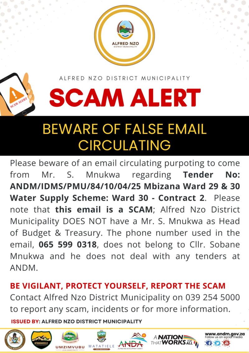 SCAM ALERT: Please beware of an email circulating purpoting to come from Mr. S. Mnukwa regarding Tender No: ANDM/IDMS/PMU/84/10/04/25 Mbizana Ward 29 & 30 Water Supply Scheme: Ward 30 – Contract 2.