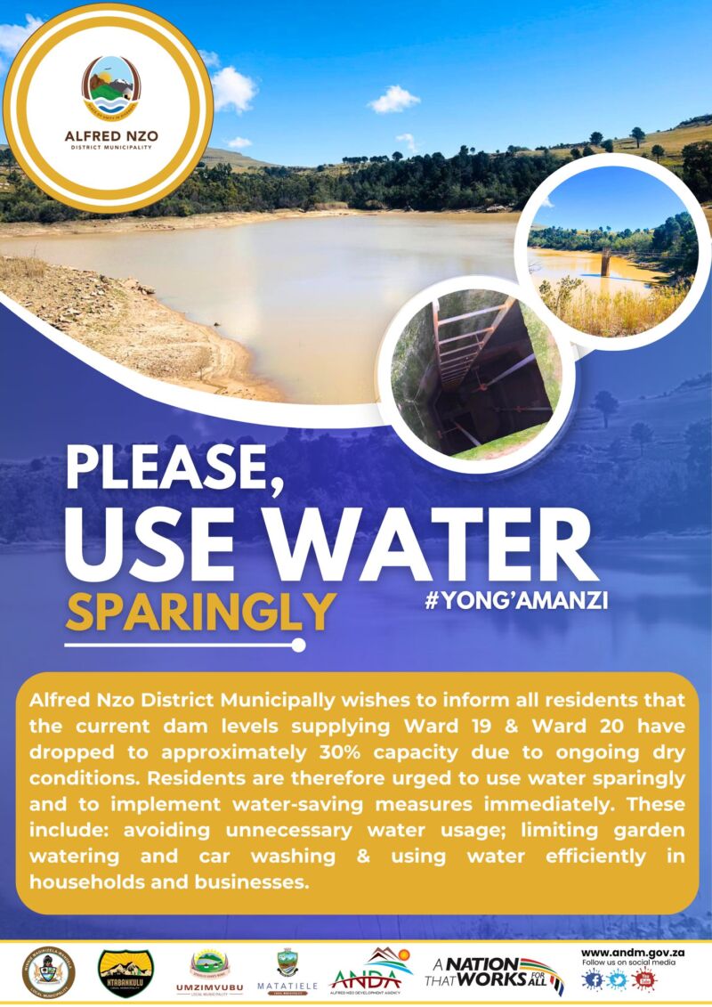 ANDM wishes to inform all residents that the current dam levels supplying Ward 19 & Ward 20 have dropped to approximately 30% capacity due to ongoing dry conditions.